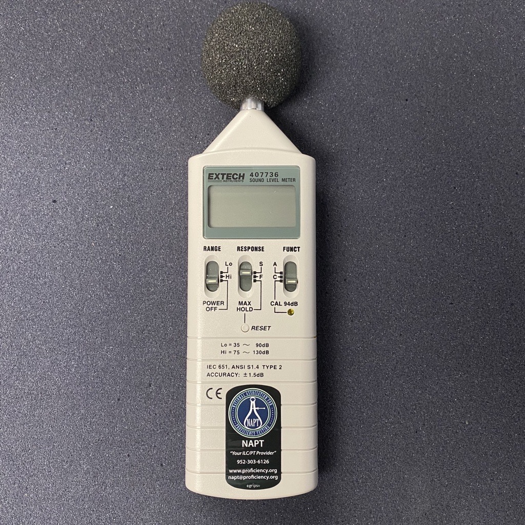 This kit contains an Extech Model 407736 Sound Level Meter. Participant will generate the following test points (100 Hz, 1 kHz, 8 kHz) at 50dB and 100 dB and report the indication of the Sound Level Meter to 0.1 dB resolution.