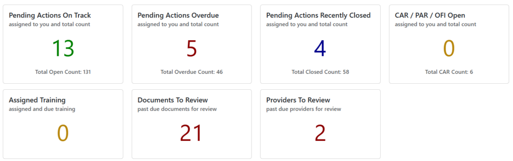 The Corrective Actions (CAR/PAR/OFI) card provides oversight of your organization’s corrective action program: